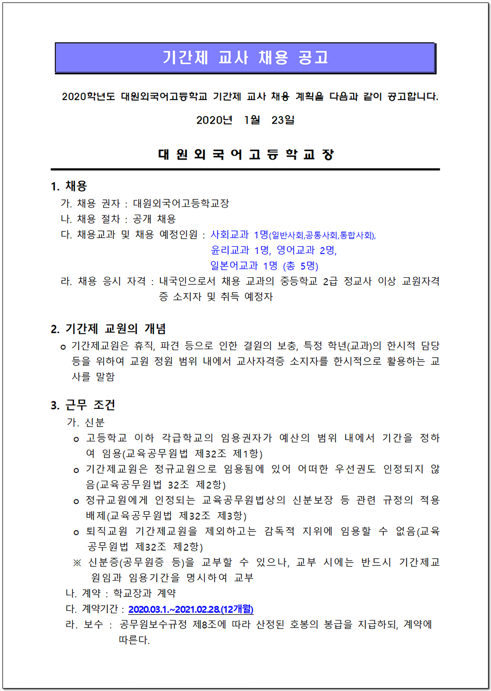 ÀÌ ÆäÀÌÁö´Â ÀÚ¹Ù½ºÅ©¸³Æ®°¡ Áö¿øµÇÁö ¾Ê´Â ºê¶ó¿ìÀú¿¡¼ ÀϺΠ±â´ÉÀÌ Á¦´ë·Î ÀÛµ¿ÇÏÁö ¾Ê½À´Ï´Ù. Á¦¸ñ 2020Çг⵵ ±â°£Á¦ ±³»ç ä¿ë °ø°í(1¿ù) À̸§ ȲÀÎÁß µî·ÏÀÏ 2020-01-23 ÷ºÎÆÄÀÏ 2020Çг⵵_´ë¿ø¿Ü°í_±â°£Á¦_±³»ç_ä¿ë_°ø°í¹®.pdf   ´Ù¿î·Îµå ¼ö : [ 75 ] Á¦Ãâ¼·ù¾ç½Ä_¸ðÀ½(´ë¿ø¿Ü°í).hwp   ´Ù¿î·Îµå ¼ö : [ 47 ] Àüü ÆÄÀÏ ´Ù¿î·Îµå ºê¶ó¿ìÀú º¸¾È ¾÷µ¥ÀÌÆ®·Î ÀÎÇÑ ´Ù¿î·Îµå ºÒ°¡ ½Ã, ´Ù¿î·Îµå ¾È³» ¿§Áö : edge://settings/content/insecureContent [Ŭ¸¯ ÈÄ ÁÖ¼Òâ¿¡ ºÙ¿©³Ö±â] Å©·Ò : chrome://settings/content/insecureContent [Ŭ¸¯ ÈÄ ÁÖ¼Òâ¿¡ ºÙ¿©³Ö±â] À§ ÁÖ¼Ò·Î Á¢±ÙÇϼż Çã¿ë ºÎºÐ¿¡ Çб³ µµ¸ÞÀÎ()À» ³Ö°í ÀúÀåÇÏ½Ã¸é ´Ù¿î·Îµå°¡ °¡´ÉÇØÁý´Ï´Ù. ÀμâÇϱ⠸ñ·Ï ÀÌÀü±Û 2020³âµµ ´ë¿ø¿Ü±¹¾î°íµîÇб³ ÀϹÝÁ÷¿ø(ÇàÁ¤Á÷) ä¿ë °ø°í / ÀÌõ¿ì 2020.01.17 ´ÙÀ½±Û 2020Çг⵵ ±â°£Á¦ ±³»ç ä¿ë ¼ö¾÷½Ç¿¬ ¹× ¸éÁ¢ ¾È³»(1¿ù) / ȲÀÎÁß 2020.02.03
