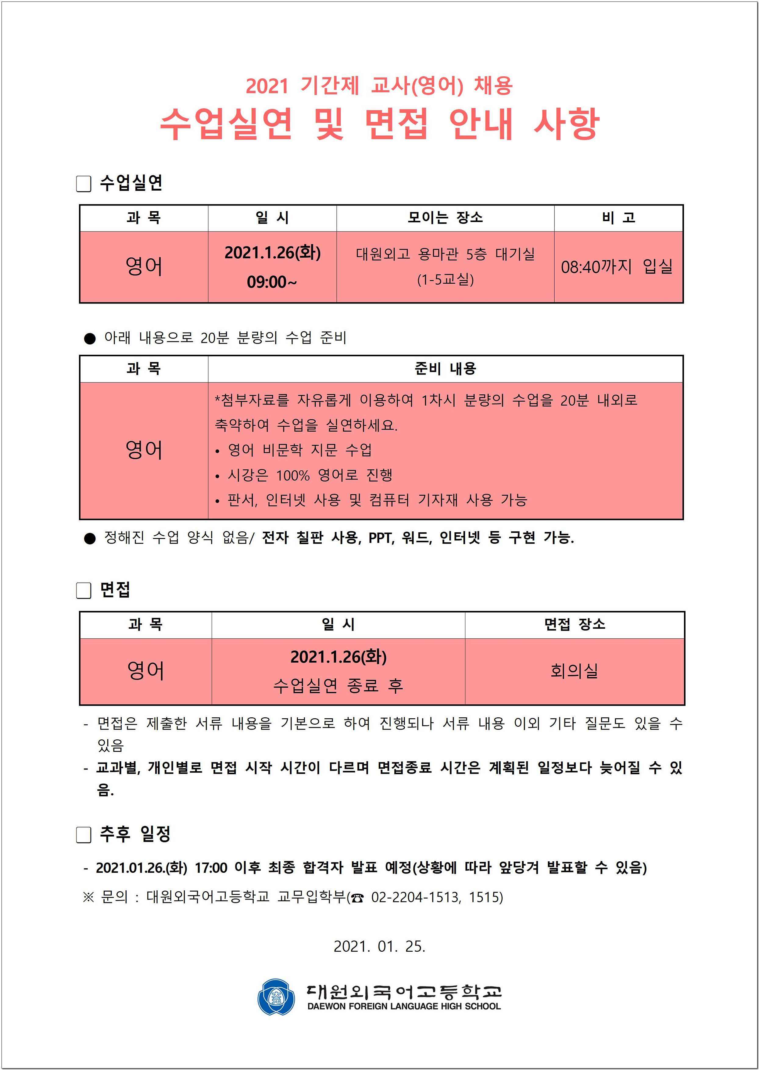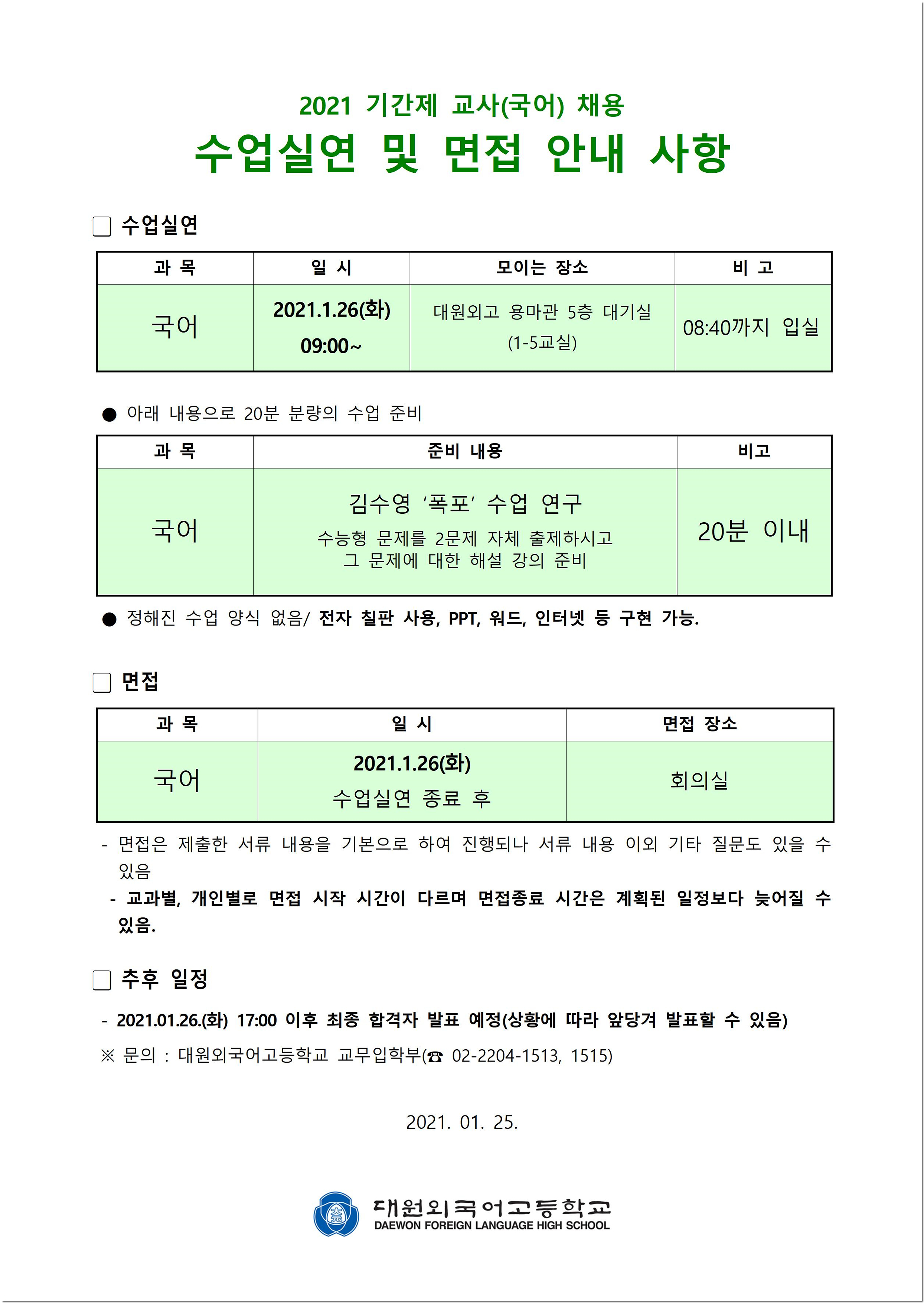 ÀÌ ÆäÀÌÁö´Â ÀÚ¹Ù½ºÅ©¸³Æ®°¡ Áö¿øµÇÁö ¾Ê´Â ºê¶ó¿ìÀú¿¡¼ ÀϺΠ±â´ÉÀÌ Á¦´ë·Î ÀÛµ¿ÇÏÁö ¾Ê½À´Ï´Ù. Á¦¸ñ 2021 ±â°£Á¦±³»ç ä¿ë ¼ö¾÷½Ç¿¬ ¹× ¸éÁ¢ ¾È³» À̸§ ´ë¿ø¿Ü°í µî·ÏÀÏ 2021-01-25 ÷ºÎÆÄÀÏ ¼ö¾÷½Ç¿¬ ¹× ¸éÁ¢ ¾È³»(ȨÆäÀÌÁö °øÁö¿ë).pdf   ´Ù¿î·Îµå ¼ö : [ 85 ] Àüü ÆÄÀÏ ´Ù¿î·Îµå ºê¶ó¿ìÀú º¸¾È ¾÷µ¥ÀÌÆ®·Î ÀÎÇÑ ´Ù¿î·Îµå ºÒ°¡ ½Ã, ´Ù¿î·Îµå ¾È³» ¿§Áö : edge://settings/content/insecureContent [Ŭ¸¯ ÈÄ ÁÖ¼Òâ¿¡ ºÙ¿©³Ö±â] Å©·Ò : chrome://settings/content/insecureContent [Ŭ¸¯ ÈÄ ÁÖ¼Òâ¿¡ ºÙ¿©³Ö±â] À§ ÁÖ¼Ò·Î Á¢±ÙÇϼż Çã¿ë ºÎºÐ¿¡ Çб³ µµ¸ÞÀÎ()À» ³Ö°í ÀúÀåÇÏ½Ã¸é ´Ù¿î·Îµå°¡ °¡´ÉÇØÁý´Ï´Ù. ÀμâÇϱ⠸ñ·Ï ÀÌÀü±Û 2021Çг⵵ ´ë¿ø¿Ü°í ±â°£Á¦ ±³»ç ä¿ë °ø°í¹® / ´ë¿ø¿Ü°í 2021.01.15 ´ÙÀ½±Û 2020Çг⵵ Á¹¾÷½Ä °£¼ÒÈ ¾È³» / ´ë¿ø¿Ü°í 2021.02.01