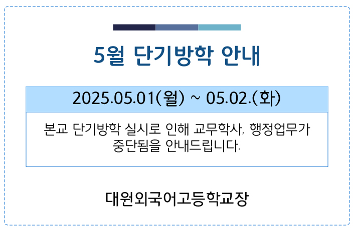 ÀÌ ÆäÀÌÁö´Â ÀÚ¹Ù½ºÅ©¸³Æ®°¡ Áö¿øµÇÁö ¾Ê´Â ºê¶ó¿ìÀú¿¡¼ ÀϺΠ±â´ÉÀÌ Á¦´ë·Î ÀÛµ¿ÇÏÁö ¾Ê½À´Ï´Ù. Á¦¸ñ 5¿ù ´Ü±â¹æÇÐ ¾È³» À̸§ ´ë¿ø¿Ü°í µî·ÏÀÏ 2025-04-30 ÷ºÎÆÄÀÏ Àüü ÆÄÀÏ ´Ù¿î·Îµå ºê¶ó¿ìÀú º¸¾È ¾÷µ¥ÀÌÆ®·Î ÀÎÇÑ ´Ù¿î·Îµå ºÒ°¡ ½Ã, ´Ù¿î·Îµå ¾È³» ¿§Áö : edge://settings/content/insecureContent [Ŭ¸¯ ÈÄ ÁÖ¼Òâ¿¡ ºÙ¿©³Ö±â] Å©·Ò : chrome://settings/content/insecureContent [Ŭ¸¯ ÈÄ ÁÖ¼Òâ¿¡ ºÙ¿©³Ö±â] À§ ÁÖ¼Ò·Î Á¢±ÙÇϼż Çã¿ë ºÎºÐ¿¡ Çб³ µµ¸ÞÀÎ()À» ³Ö°í ÀúÀåÇÏ½Ã¸é ´Ù¿î·Îµå°¡ °¡´ÉÇØÁý´Ï´Ù. ÀμâÇϱ⠸ñ·Ï ÀÌÀü±Û 2028Çг⵵ ´ëÇмöÇдɷ½ÃÇè ¿¹½Ã¹®Ç× ¾È³» Ã¥ÀÚ(ÆÄÀÏ) ´Ù¿î·Îµå / ¹Ú¼º¹Î 2025.04.23 ´ÙÀ½±Û 2025Çг⵵ ´ë¿ø¿Ü±¹¾î°íµîÇб³ 1Çг⠼ұԸðÅ׸¶Çü±³À°¿©Çà À§Å¹¿ë¿ª ÀÔÂû °ø°í / ±èÁÖ¿µ 2025.05.06
