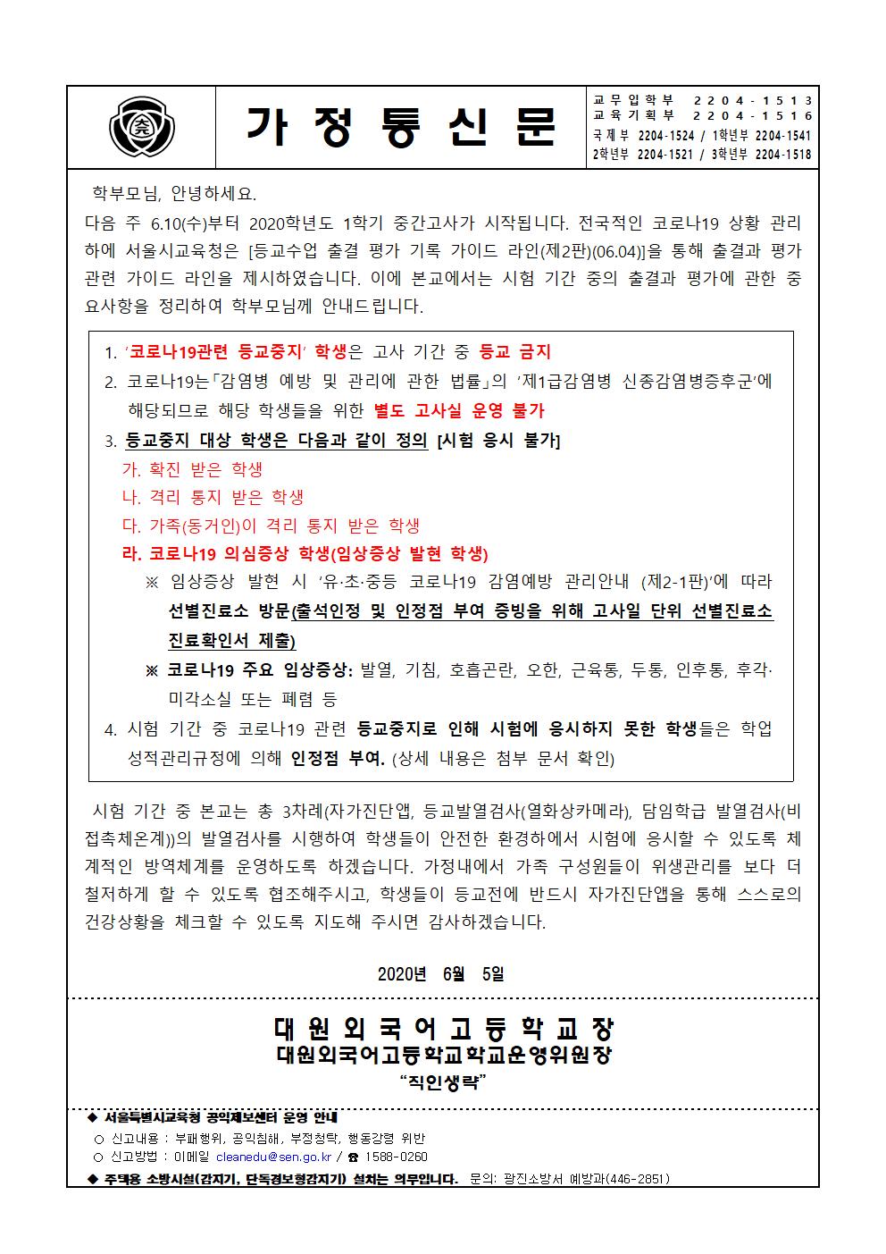 ÀÌ ÆäÀÌÁö´Â ÀÚ¹Ù½ºÅ©¸³Æ®°¡ Áö¿øµÇÁö ¾Ê´Â ºê¶ó¿ìÀú¿¡¼ ÀϺΠ±â´ÉÀÌ Á¦´ë·Î ÀÛµ¿ÇÏÁö ¾Ê½À´Ï´Ù. Á¦¸ñ ½ÃÇè ±â°£ ÁßÀÇ Ãâ°á°ú Æò°¡¿¡ °üÇÑ Áß¿ä»çÇ× ¾È³» À̸§ ´ë¿ø¿Ü°í µî·ÏÀÏ 2020-06-08 ÷ºÎÆÄÀÏ ½ÃÇè_±â°£_ÁßÀÇ_Ãâ°á°ú_Æò°¡¿¡_°üÇÑ_Áß¿ä»çÇ×_¾È³»_°¡Á¤Åë½Å¹®.pdf   ´Ù¿î·Îµå ¼ö : [ 56 ] Àüü ÆÄÀÏ ´Ù¿î·Îµå ºê¶ó¿ìÀú º¸¾È ¾÷µ¥ÀÌÆ®·Î ÀÎÇÑ ´Ù¿î·Îµå ºÒ°¡ ½Ã, ´Ù¿î·Îµå ¾È³» ¿§Áö : edge://settings/content/insecureContent [Ŭ¸¯ ÈÄ ÁÖ¼Òâ¿¡ ºÙ¿©³Ö±â] Å©·Ò : chrome://settings/content/insecureContent [Ŭ¸¯ ÈÄ ÁÖ¼Òâ¿¡ ºÙ¿©³Ö±â] À§ ÁÖ¼Ò·Î Á¢±ÙÇϼż Çã¿ë ºÎºÐ¿¡ Çб³ µµ¸ÞÀÎ()À» ³Ö°í ÀúÀåÇÏ½Ã¸é ´Ù¿î·Îµå°¡ °¡´ÉÇØÁý´Ï´Ù. ÀμâÇϱ⠸ñ·Ï ÀÌÀü±Û Çлý ½ÄÀç·á ²Ù·¯¹Ì ÄíÆù ÀÚ¹ßÀû ±âºÎ ¾È³» / ´ë¿ø¿Ü°í 2020.06.08 ´ÙÀ½±Û 2020Çг⵵ ±³À°Á¤º¸È(ÀÎÅͳÝÅë½Åºñ) Áö¿ø ¾È³» / ¹é¼öÁø 2020.06.11