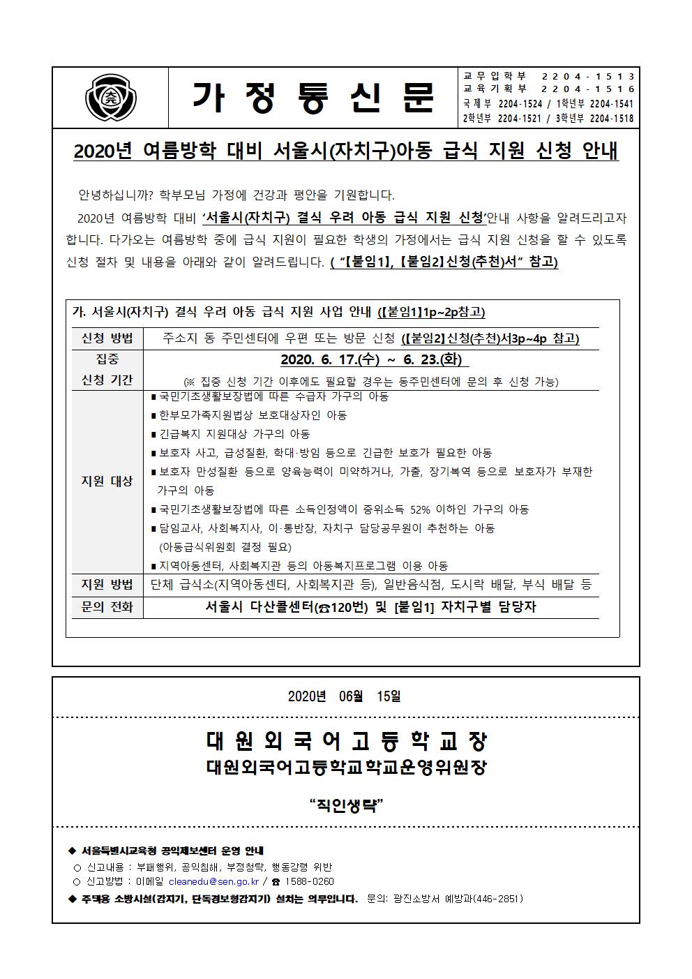 - 2020³â ¿©¸§¹æÇÐ ´ëºñ ¼¿ï½Ã(ÀÚÄ¡±¸) ¾Æµ¿ ±Þ½Ä Áö¿ø ½Åû °¡Á¤Åë½Å¹®
